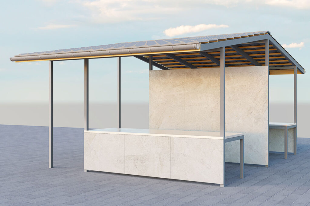 Stalowa konstrukcja wiaty handlowej charakteryzuje się dużą wytrzymałością i solidnością jednocześnie nie tracąc na estetyce i wygodzie użytkowania.